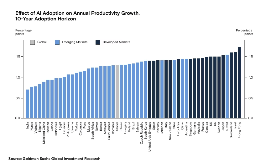 GAI hat das Potenzial, die globale Wirtschaft grundlegend zu verändern. Goldman Sachs prognostiziert eine mögliche Steigerung des globalen BIP um 7 % und eine Steigerung des Produktivitätswachstums um 1,5 Prozentpunkte über einen Zeitraum von zehn Jahren. Diese Auswirkungen ergeben sich aus der Verbesserung der Arbeitskapazitäten durch KI und der möglichen Neubeschäftigung von durch Automatisierung verdrängten Arbeitskräften.